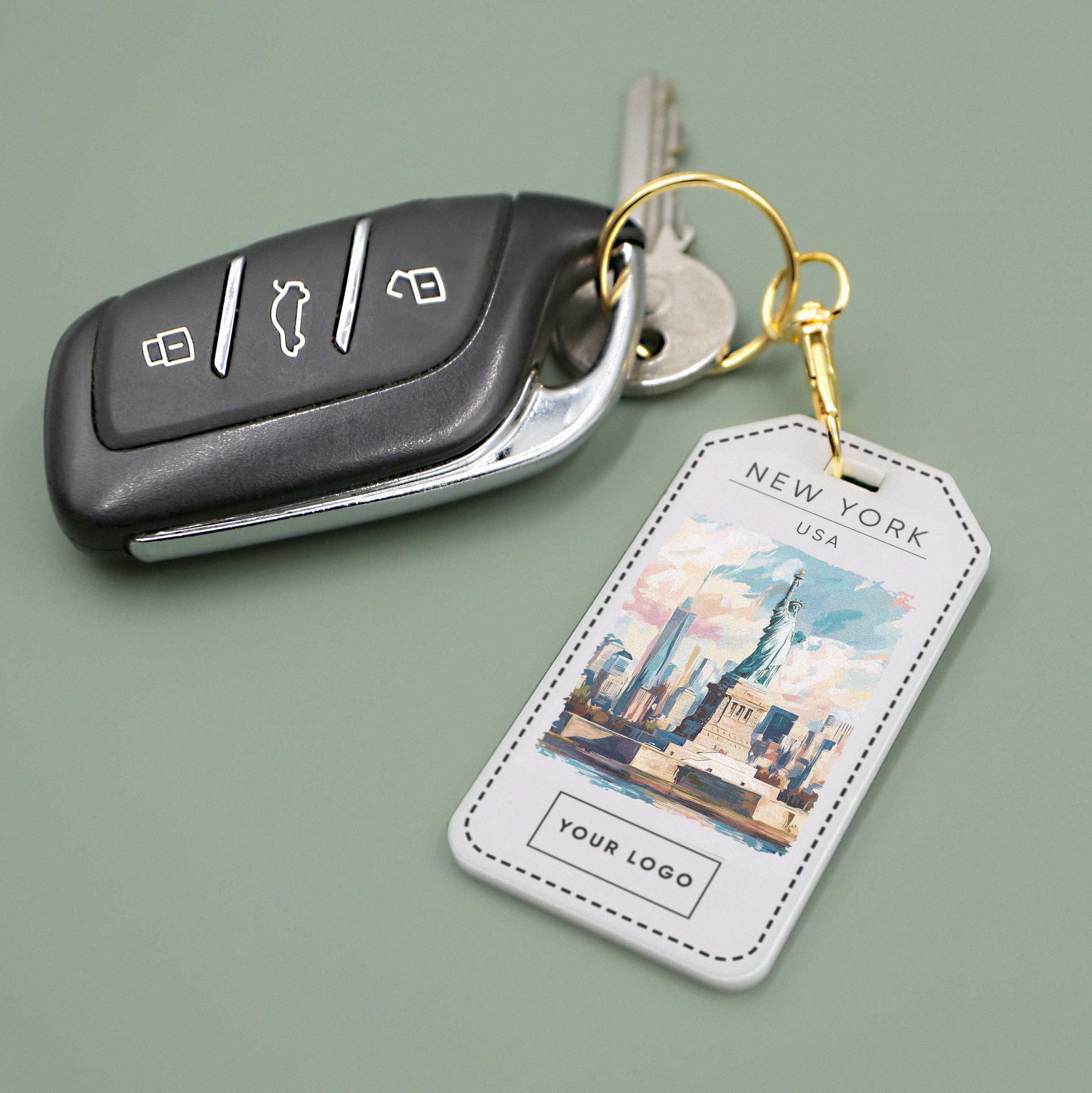 Crafted from 3mm white matte acrylic, this high-quality tag features a UV-printed postcard-style design to match your wallet. The back can be personalised with your clients name, contact details, and even your travel advisor’s logo. Comes with a black PU strap and gold buckle.