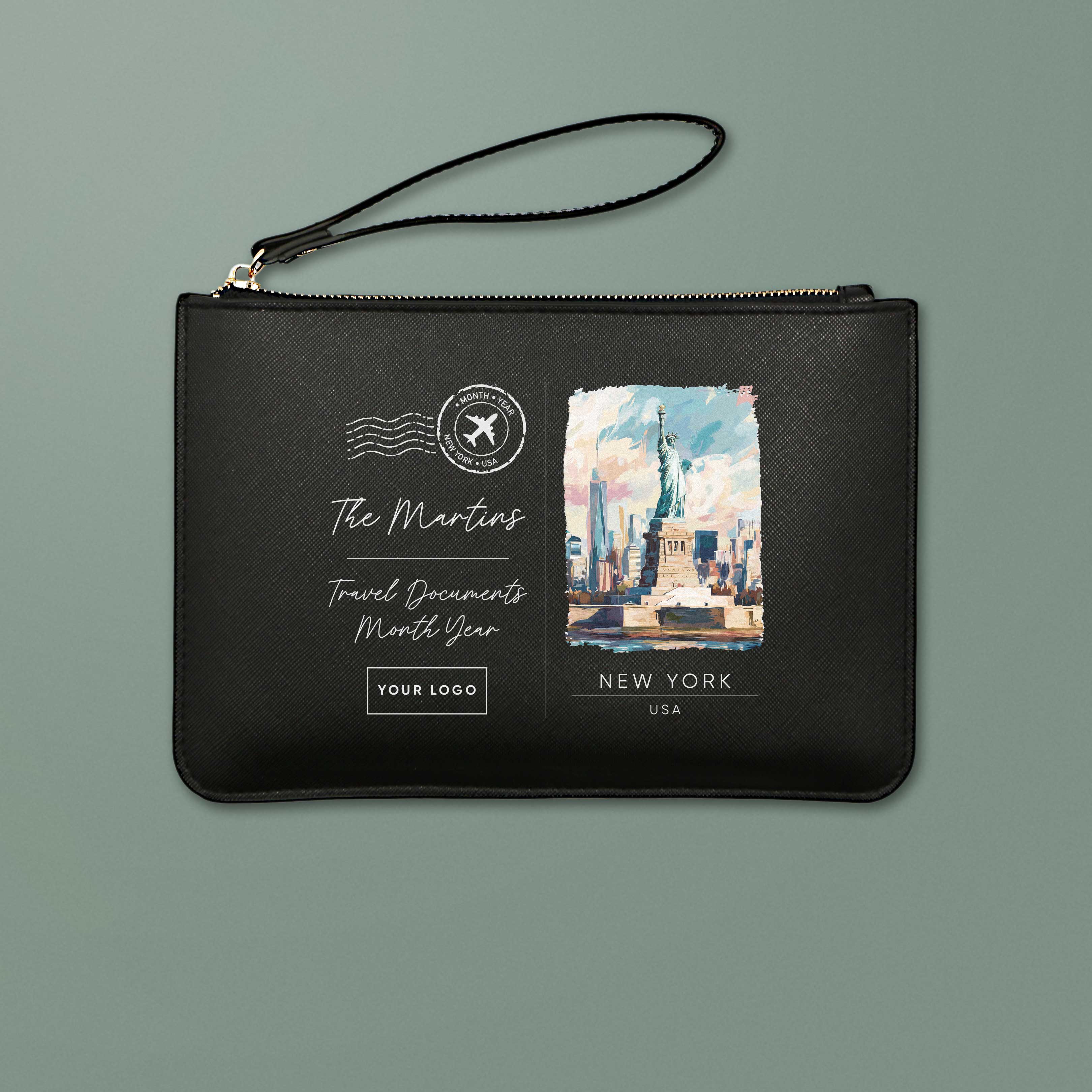 Crafted from PU Saffiano fine-grain material with a soft-touch lining, each wallet is finished with high-shine gold hardware and a matching wristlet strap. Personalise yours with any destination, for a keepsake that’s both practical and unique.
